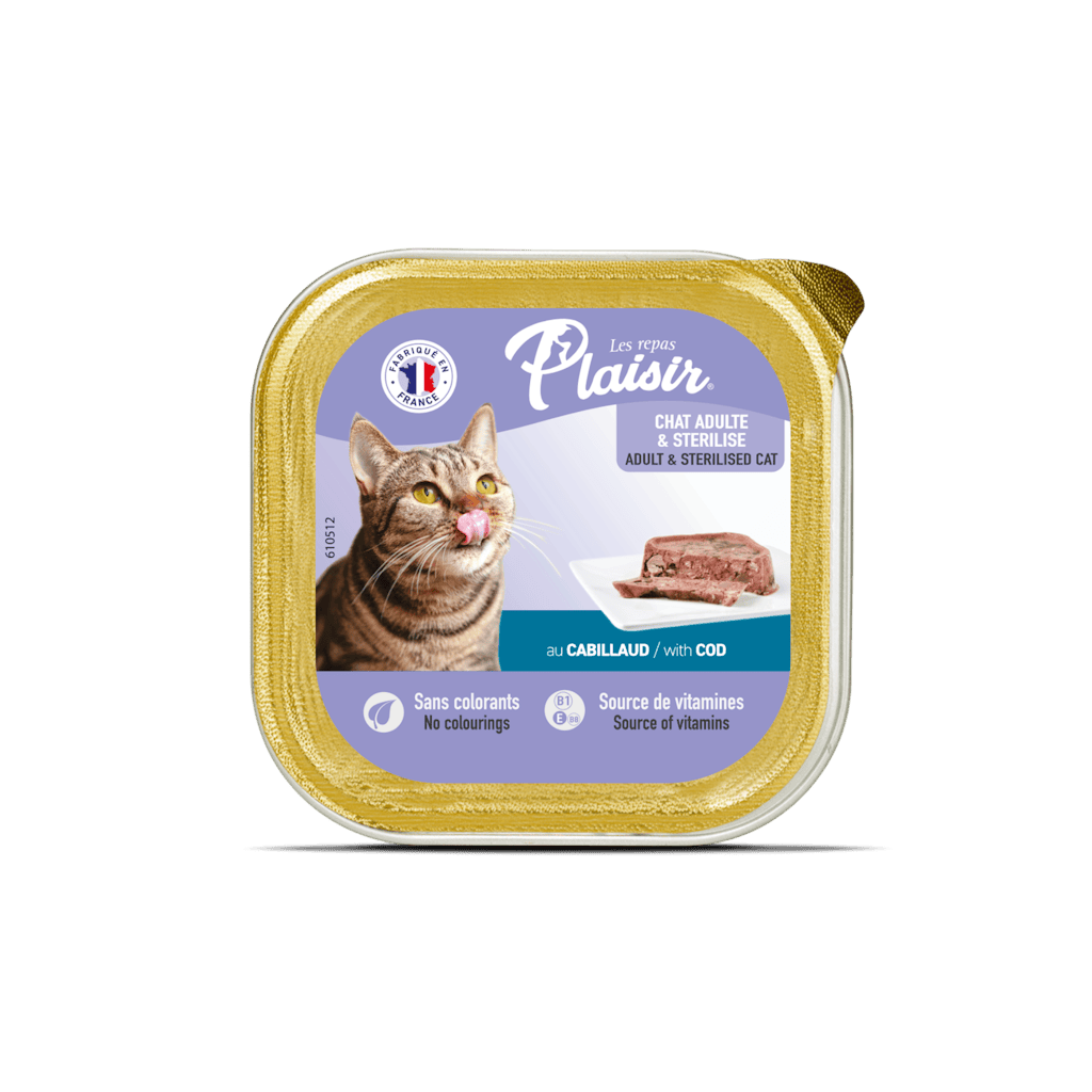 Pour les chats adorant les recettes au poisson, voici une autre variante au Cabillaud. Les pâtées Les Repas Plaisir sont formulées avec l'expertise de nos vétérinaires et avec des ingrédients de qualité, pour répondre aux besoins quotidiens de votre chat. Convient aux chats adultes stérilisés.