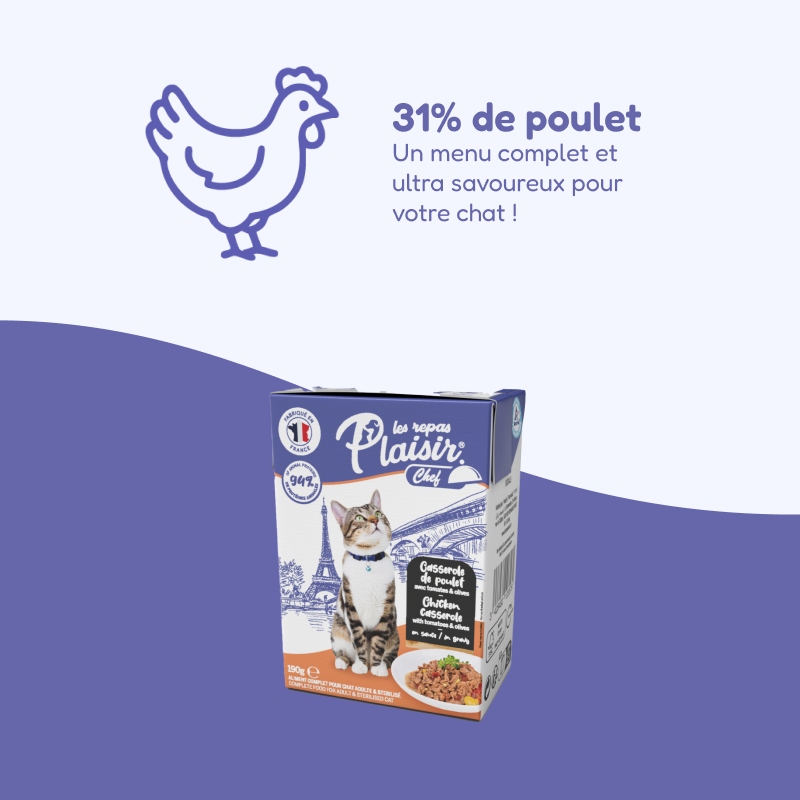 Partons vers la Méditerranée, le goût des tomates, des olives… votre chat ne résistera pas à nos casseroles en sauce, concoctées avec plus de 30% de poulet.