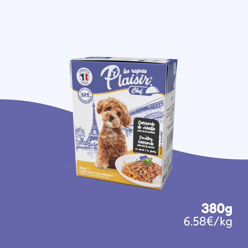Une portion généreuse d'effilés en sauce avec plus de 30% de volaille et cuisinée avec du riz et des carottes. C'est la "blanquette" qui s'invite dans la gamelle de votre chien. Waouf !