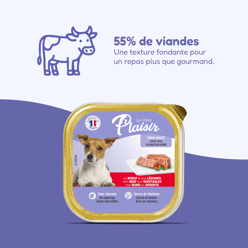 Les pâtées Les Repas Plaisir pour chien contiennent minimum 55% de viandes et sous produits animaux. Leur mode de fabrication avec des ingrédients frais, leur mode de cuisson à la vapeur, ainsi que leur liste d'ingrédients courte en font l'un des meilleurs aliments pour votre compagnon préféré. Cette recette au Bœuf est composée aussi de légumes, source complémentaires de fibres. Sans colorants et sans céréales ajoutées.