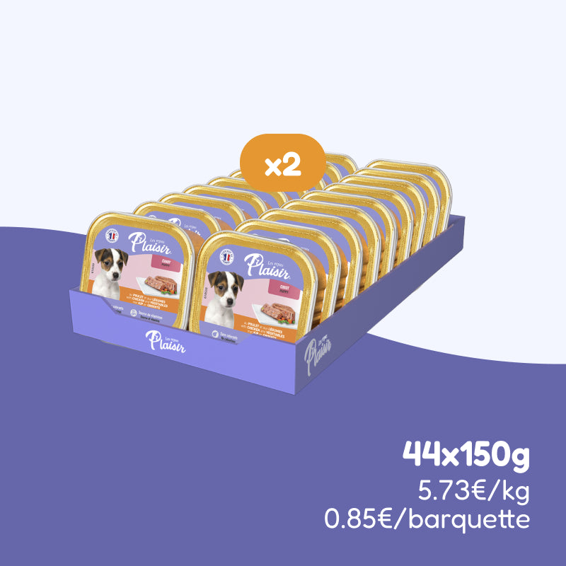 150g de plaisir au Poulet ! Voici une recette adaptée et parfaite pour votre petit chiot : riche en protéine et source de minéraux & vitamines pour aider à une bonne croissance. Sans colorants et sans céréales ajoutées. Existe aussi en 300g, avec des légumes.